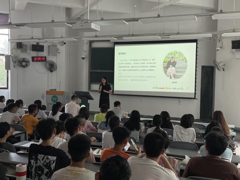 “用生命影响生命,用专业助力成长。”成都市爱有戏社区发展中心副主任余长芳向同学们分享作为一名“老社工”的心路历程。余老师以自身在灾区的社会工作经验引导同学们在社会服务实践中深度认同社会工作专业;以真实的行业从业者案例展现社会工作的多样性、创新性。