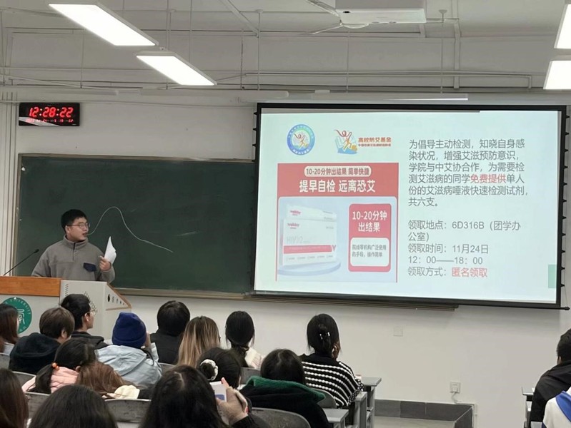 另外,为倡导主动检测,知晓自身感染状况,增强艾滋预防意识,学院与中艾协合作,为需要检测艾滋病的同学免费提供单人份的艾滋病唾液快速检测试剂,供同学们匿名领取。