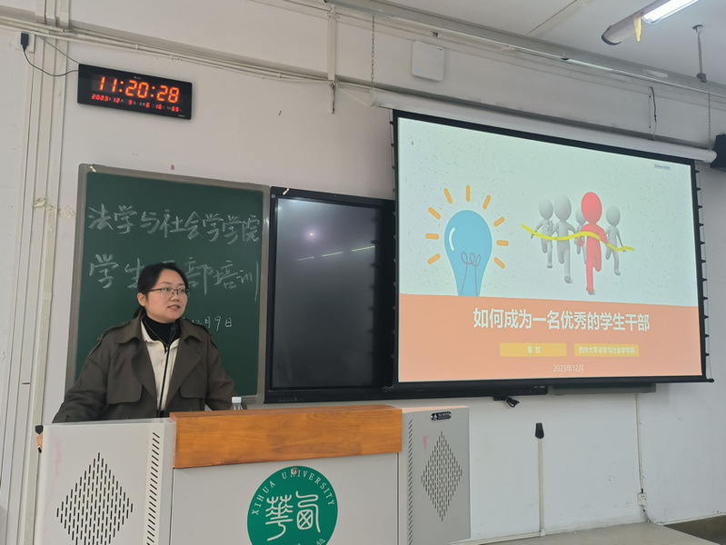 为深入学习习近平总书记关于青年工作的重要论述,深入学习贯彻党的二十大精神,进一步加强学院班团建设和学生干部队伍建设,引导我院青年学生干部在真学真信中坚定理想信念,在学思践悟中牢记初心使命,在细照笃行中不断修炼自我,在知行合一中主动担当作为。2023年12月9日,法学与社会学学院举行了学院学生干部素质能力提升培训活动。学院全体团委学生会的学生干部,2022级、2023级班长团支书参加了此次活动。本次培训分为理论学习和工作技能培训两个部分,以主题讲座和主题研讨的形式进行。