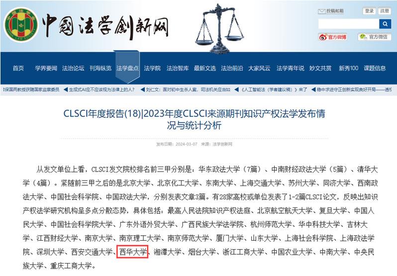近日中国法学创新网发布了《2023年度CLSCI来源期刊知识产权法学发布情况与统计分析》。2023年度来自40家研究机构的学者在知识产权法学CLSCI来源期刊发表论文73篇,西华大学位列40家发文单位之一。张利国教授发表在CLSCI期刊《政治与法律》上的论文《论数字技术对表演者权保护的冲击与法律上的回应》,提出了应对数字技术冲击有效加强表演者权保护的具体方案。