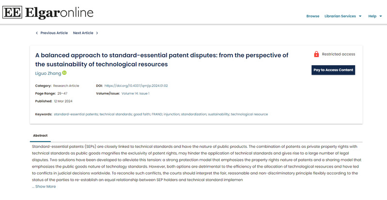 我校法学与社会学学院(知识产权学院)张利国教授在国际知识产权一流期刊Queen Mary Journal of Intellectual Property 2024年第1期发表了学术论文“A balanced approach to standard-essential patent disputes: from the perspective of the sustainability of technological resources”,该文分析了解决专利与技术标准冲突的两种方案,指出这两种方案都不利于技术资源的配置效率,进而提出法律解释要维护标准必要专利权利人与技术标准实施者之间的平等关系,促进当事人自愿达成专利许可协议的解决方案。
