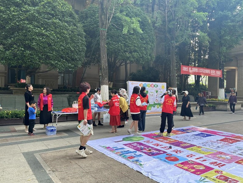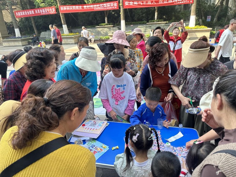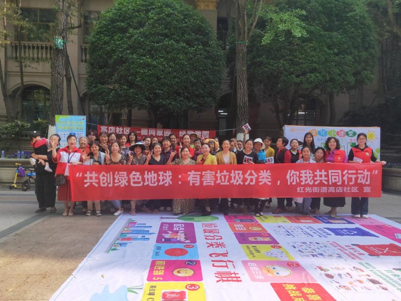 在与负责人沟通对接后,志愿者们一同进入社区,帮忙布置现场,挂横幅、摆展板,将桌子、零食、礼品、签到表摆放好。随后志愿者们分工协作,有的负责发放宣传单、有的引导小朋友们参加垃圾分类飞行棋游戏、有的通过知识问答向居民们科普知识、有的协助小朋友们制作手工。居民们积极参与其中,现场既热闹非凡又井然有序。最后社区为参与本次活动的居民发放了小礼品,大家一起合影留念。在其乐融融的氛围中,本次垃圾分类志愿活动圆满结束。