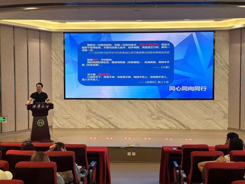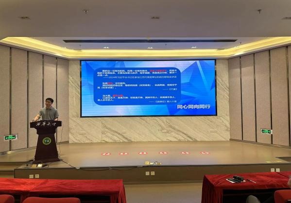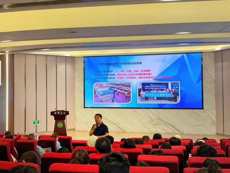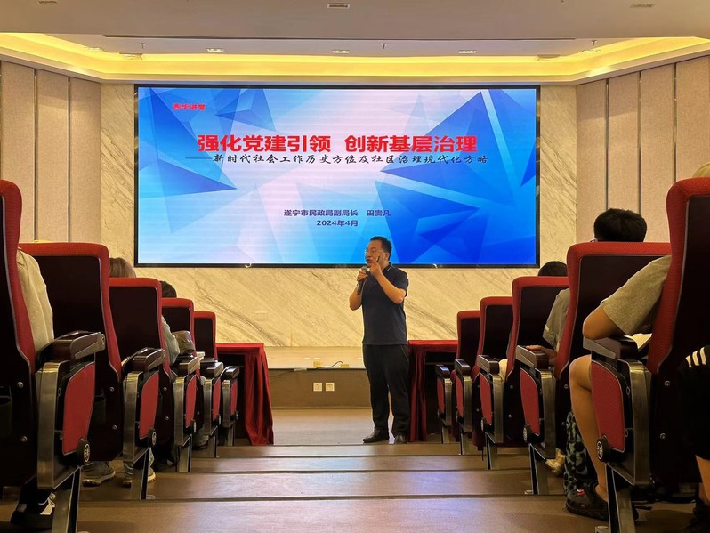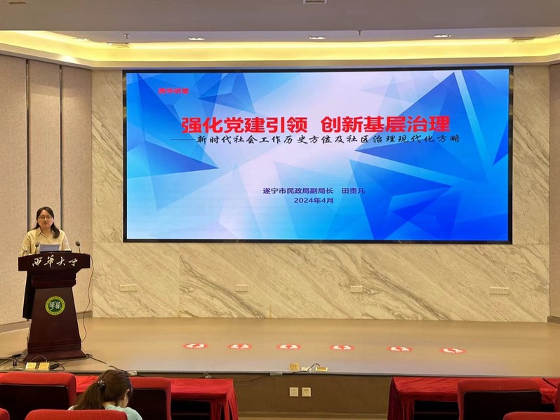 为深入探讨党建对基层治理的引领作用,促进基层治理工作的创新与提升,进一步深化学生对社会工作这一专业的认识,4月28日上午,法学与社会学学院特邀遂宁市民政局副局长、高级社会工作师、社会工作实务专家田贵凡开展 “强化党建领导,创新基层治理”专题讲座。学院党委副书记廖磊、副院长熊征及220余名师生代表参加了此次讲座。讲座由学工办主任奉姣主持。