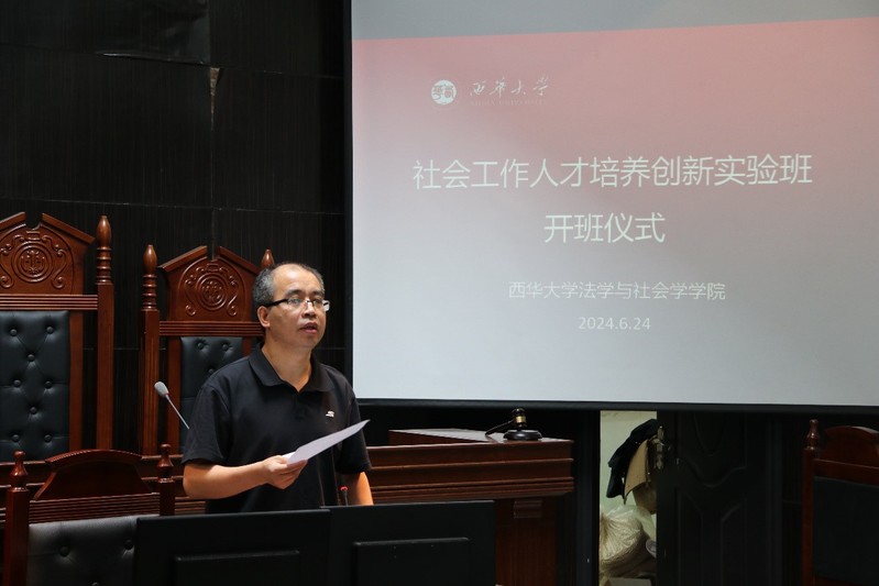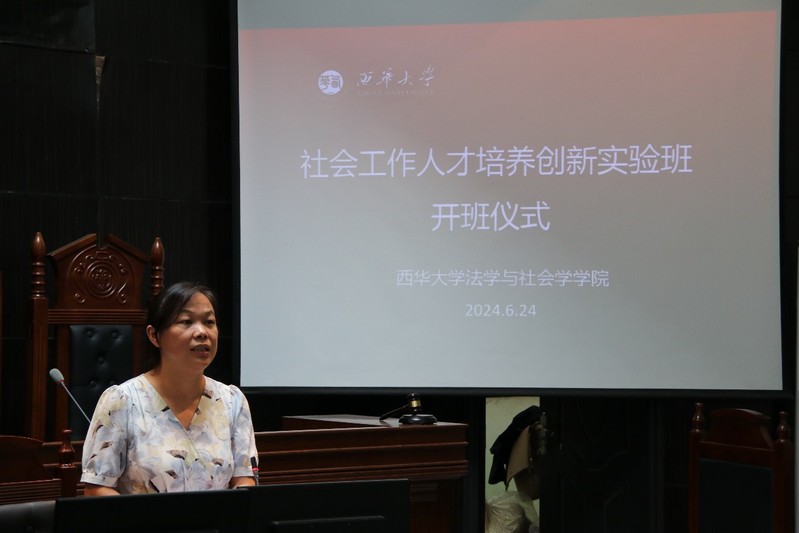 为培养具有创新精神和实践能力的高素质社会工作人才,以四川省民政厅与西华大学等三所高校签署的《社会工作人才培养战略合作协议》为背景,6月24日下午,法学与社会学学院社会工作人才培养创新实验班开班仪式在学校新模拟法庭举行,学院领导班子成员、教务处相关负责人、校外导师代表、社会工作系教师、创新实验班全体学员等40余人出席活动。此次开班仪式由学院副院长熊征主持。