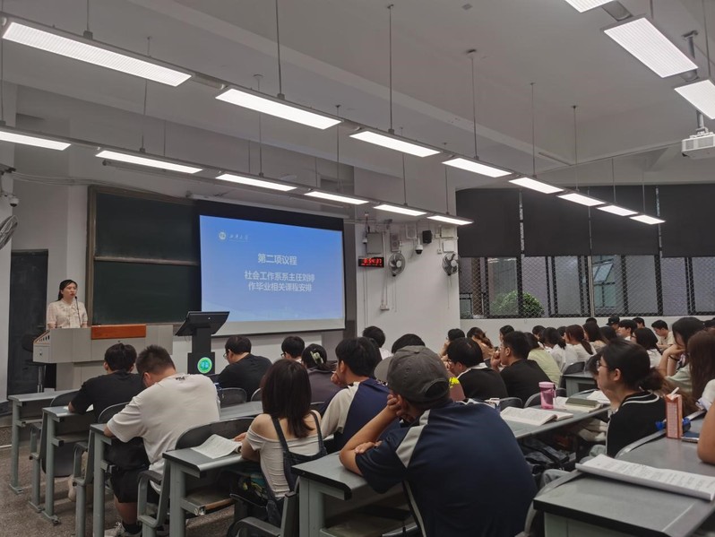 大会的第二项议程,系主任刘婷作毕业相关课程安排。刘婷老师详细介绍了学生培养、大四相关课程安排及毕业审核相关工作,就科技创新实践活动认定学分作详细介绍。社会工作本科学生修读期间需进行相应的科技创新实践活动,活动包括创业训练、各类竞赛、发表学术论文、承担科研项目、参加学术报告以及志愿活动。