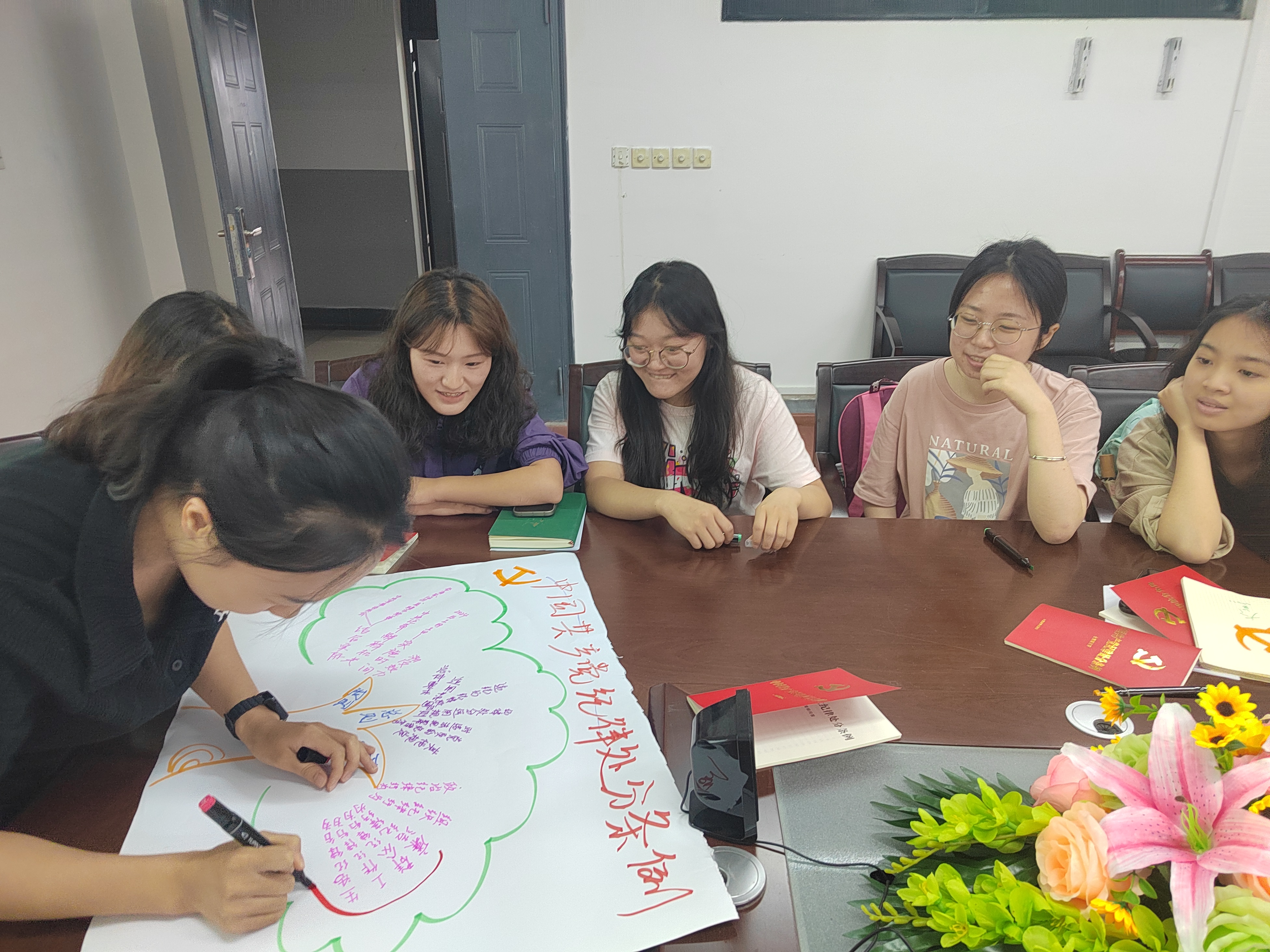 党课的第三个环节是分组作图。一个小组负责绘制《中国共产党纪律处分条例》中相关条文的思维导图,通过可视化的方式展现条例的主要内容和逻辑结构,帮助同学们更直观地把握条例精神。另一个小组则结合学生在校期间的学习和生活情况,对照《中国共产党纪律处分条例》查找相关问题,并提出解决方法。