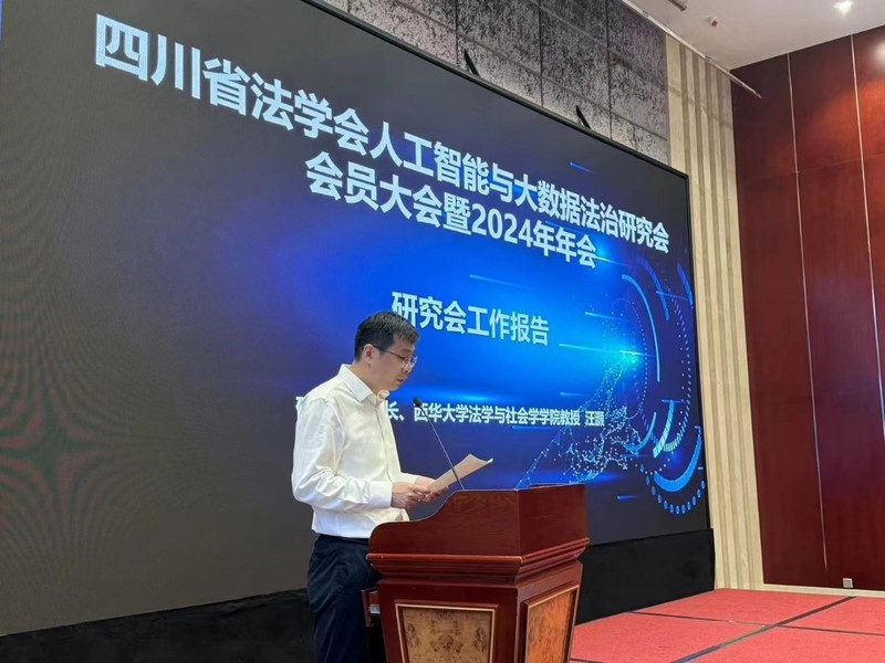 本次会议议程分为五个部分。第一项议程为政治主题学习和研究会五年工作报告,由我院余嘉勉副教授主持。全体参会人员认真学习了党的二十届三中全会精神,学习后由我院汪灏教授作了研究会五年工作报告。第二项议程是四川省法学会人工智能与大数据法治研究会的会员大会暨换届选举大会,由我院张利国教授主持。四川省法学会学术部主任苟元勋代表省法学会发表了重要讲话,对研究会过去五年的工作进行了积极的肯定,对研究会未来工作提出了三点要求,并宣读了《四川省法学会关于同意四川省法学会人工智能与大数据法治研究会换届的批复》。会议严格按照四川省法学会的管理规则选举产生了新一届四川省法学会人工智能与大数据法治研究会常务理事、副会长、秘书长和会长。郑鈜研究员当选为研究会会长,我院汪灏教授当选为研究会常务副会长、张利国教授当选为研究会副会长,余嘉勉副教授当选为研究会秘书长、罗娟副教授当选为副秘书长,我院李西臣教授、吉方英老师、贾年龙老师、杨尊源老师、周春光老师、郑少飞老师、蒋平老师等十余名老师成为研究会常务理事和理事。午餐后会议进行第三项议程,该议程为基调发言,由成都理工大学党委副书记唐清利教授主持,来自四川大学的王竹教授和我院的张利国教授分别作了“人工智能时代的《民法典》医疗数据治理体系”和“比较视野下的人工智能立法”的主旨演讲。第四项议程为2024年年会学术研讨会,由研究会副会长四川大学计算机学院彭德中教授主持。来自香港中文大学、北京泡泡玛特公司、西南交通大学、四川师范大学、西南政法大学、西华大学和成华区人民法院的六位专家进行了精彩的发言。我院杨棋老师的论文获得一等奖并参与大会研讨会发言,我院李西臣教授和成都理工大学杨会教授作了细致独到的点评。会议第五项议程为征文评选和会议总结,首先由研究会秘书长暨我院的余嘉勉副教授宣读了本次会议征文获奖情况,本次征文一共收到来自包括香港中文大学、北京大学、海南大学、华东政法、西南政法、西北政法、四川大学、湘潭大学等全国50余所高校知名高校和北京、天津、南京、贵州等20余家检察院、法院等实务机构的187篇论文,其中有效参评论文178篇。我院研究生沈子琪、罗慧、车若愚分获二三等奖。随后由研究会新任常务副会长暨我院汪灏教授作了会议总结并宣布会议胜利闭幕。