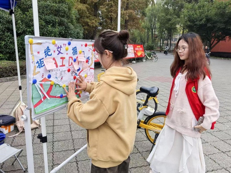 为增强在校大学生的防范艾滋病意识,倡导健康生活方式,消除对艾滋病患者的歧视,11月14日,法学与社会学学院青年志愿者服物队的志愿者们在明德广场开展了“‘防艾’——拒绝‘艾’,拥抱爱”志愿活动。