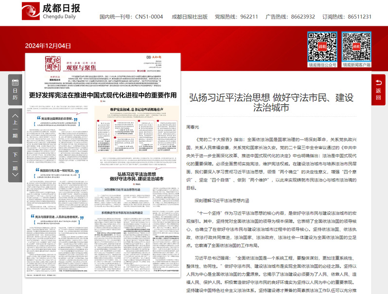 12月4日,我校法学与社会学学院周春光博士撰写的实事文章《弘扬习近平法治思想 做好守法市民、建设法治城市》刊登在《成都日报》-理论周刊板块。