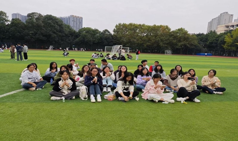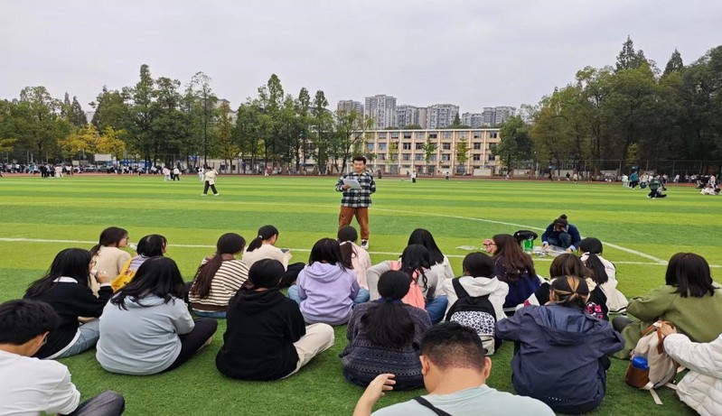 活动开始前,法学一班全体同学来到西华大学锦地苑操场集合,并在心理委员的组织下席地而坐。