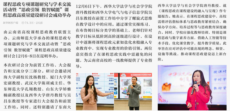 由云南省高校课程思政教育联盟主办,云南师范大学承办的课程思政专项课题研究与学术交流活动暨“思政引领 数智赋能”课程思政高质量建设研讨会12月6-8日在昆明举办,我院法学系教师唐丹教授应邀参加本次学术交流活动。