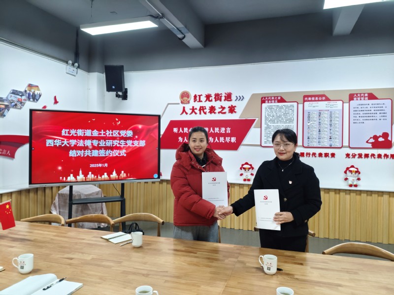 为构建“互带互动、资源共享、共同发展”的高校与社区共建合作新格局,2025年1月10日下午,西华大学法学与社会学学院法律专业研究生党支部与红光街道金土社区党委举行了党建结对共建协议签约仪式。