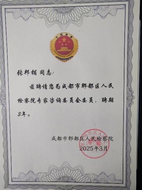 2025年3月20日,成都市郫都区人民检察院举行专家咨询委员聘任仪式。检察院党组书记、检察长贾颖出席仪式并讲话。法学与社会学学院院长张邦铺教授获聘专家咨询委员。