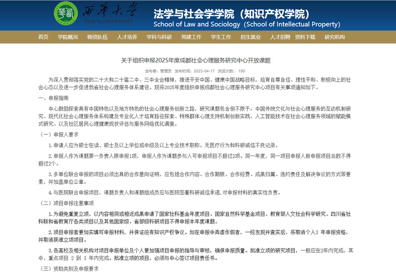 成都社会心理服务研究中心发布2025年开放课题申报通知