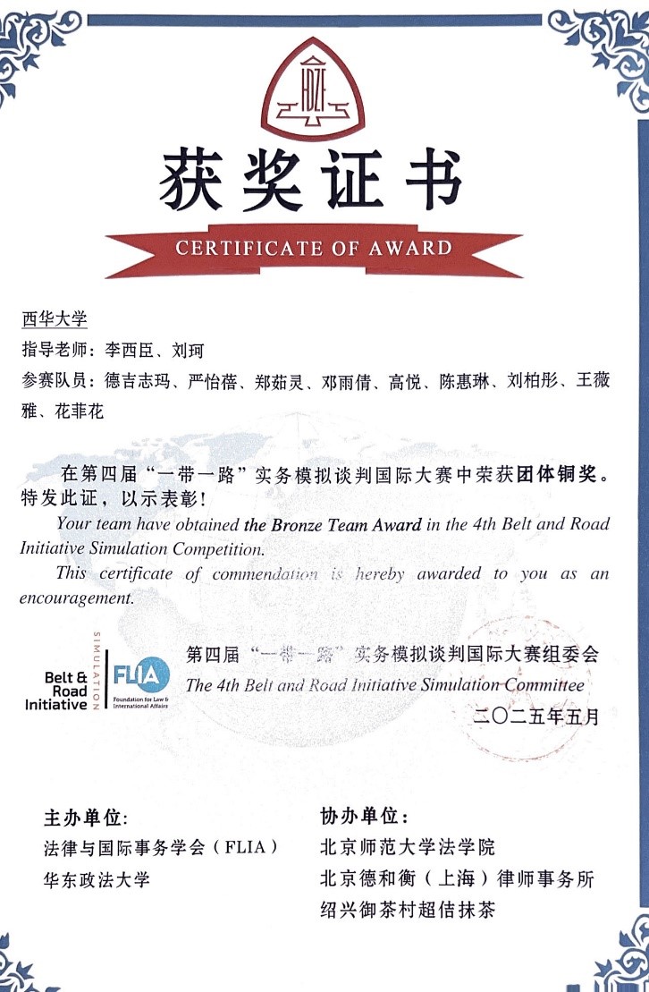 近日,由法律与国际事务学会(Foundation for Law and International Affairs)与华东政法大学联合主办的第四届“一带一路”实务模拟谈判国际大赛在华东政法大学松江校区圆满落幕。由法学与社会学学院李西臣教授和刘珂老师指导、2023级法学专业的德吉志玛、严怡蓓、郑茹灵、邓雨倩、高悦、陈惠琳6位同学和外国语学院2022级英语专业的刘柏彤、王薇雅、花菲花3位同学组成的西华大学代表队获得团体铜奖,学院2023级法学专业郑茹灵同学荣获最佳外交风采金奖,刘珂老师获得最佳教练奖。