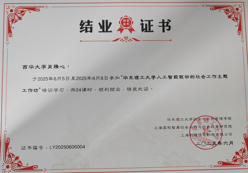 65日至8日,华东理工大学社会与公共管理学院、上海高校智库社会工作与社会政策研究院主办的《人工智能驱动的社会工作主题工作坊》在上海成功举办。西华大学法学与社会学学院教师肖雅心全程参与此次培训学习,并顺利获得结业证书。