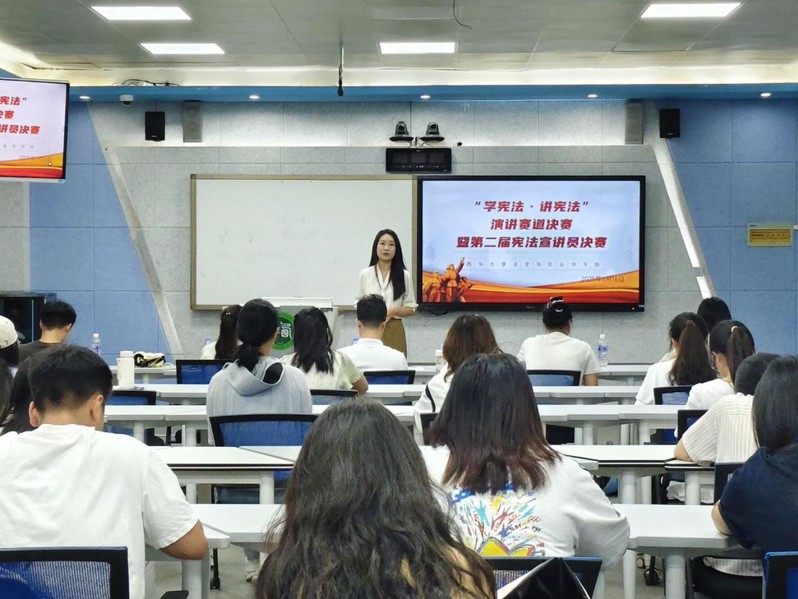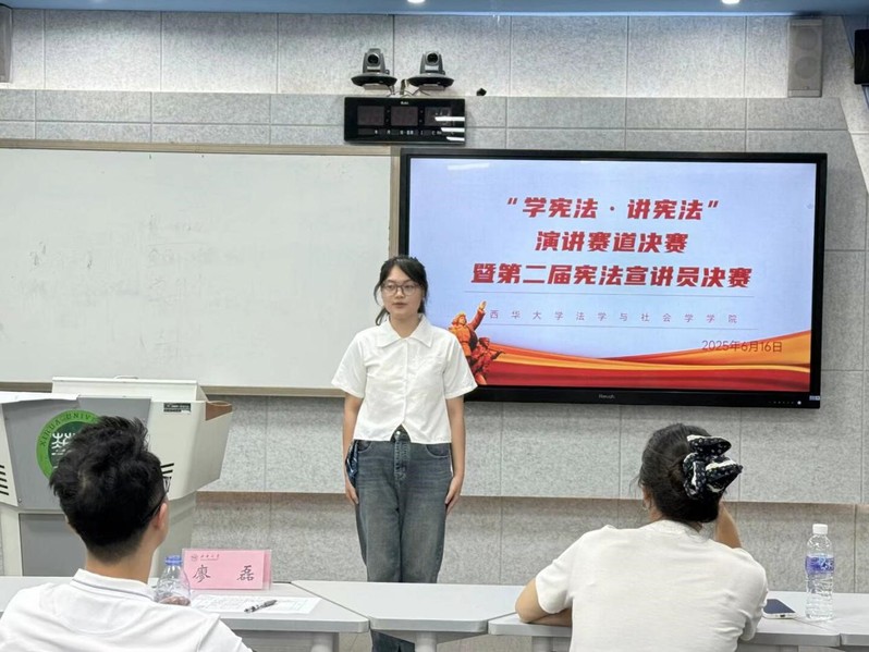 2025年6月16日下午,由西华大学法学与社会学学院主办的第二届宪法宣讲员决赛在5B-210教室圆满落下帷幕。学院党委副书记纪委书记廖磊、团委书记范锡林、辅导员高会、齐鑫、陈莎、马泽鑫受邀作为评委出席本次活动。
