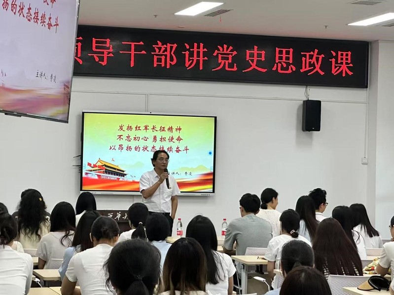 费凌教授以“发扬红军长征精神,不忘初心,勇担使命”为题,以1935年5月会理会议为切入点,结合历史影像资料,生动讲述了中国共产党在逆境中坚守初心、为民族谋复兴的奋斗历程。他还对毕业生党员提出五点期望:1.目标引领,树立近期、中期、长期目标,以“咬定青山不放松”的定力笃行致远;2.实事求是,立足自身实际,响应时代与国家需求,将个人奋斗融入民族复兴伟业;3.脚踏实地,以“积跬步至千里”的韧劲,在平凡岗位中创造不平凡业绩;4.永葆初心:牢记党员身份,在关键时刻冲得上、顶得住、打得赢;5.薪火相传:佩戴党徽铭初心,送行仪式寄厚望。希望同学们在新的人生旅途上,发扬红军长征精神,不忘初心,勇担使命,以昂扬的状态继续备斗。