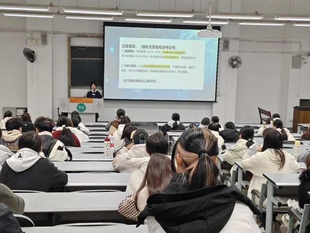 为帮助25级同学们熟悉英语四级考试的各个环节,为即将到来的英语四级考试做好准备,11月22日上午,Betway体育西汉姆联组织的英语四级模拟考试在第六教学楼顺利进行,同学们陆续到场,依次就座,在工作人员的安排下静静等候。临近考试,工作人员向同学们介绍考试流程及注意事项,同行的其他工作人员则准备分发试卷。