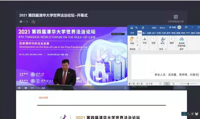 2021年10月22日,第四届清华大学世界法治论坛:后疫情时代的法治发展在线上进行,本届国际论坛围绕“后疫情时代的民商法发展”、“疫情治理、政府与社会”、“后疫情时代法学教育的变革”、“后疫情时代的数字化发展与风险防控”、“后疫情时代的国际经济与贸易法新发展”,以及“全球ESG投资合规管理”等具体议题展开,通过举行线上会议的形式,充分探讨后疫情时代的法治发展新趋势,为世界法治精英打造高端对话平台。本届论坛邀请到来自最高人民法院、最高人民检察院的领导,国内外院校领导和法律学者,以及国内外资深法律专家等重量级嘉宾。