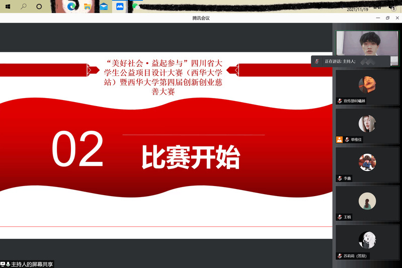 11月19日下午,“美好社会·益起参与”四川省大学生公益项目设计大赛决赛(西华大学站)暨西华大学第四届创新创业慈善大赛答辩会在线上举行。大赛邀请了西华大学法学与社会学学院熊征老师、刘文娜老师、冉连老师和谢缘老师担任本次大赛评委。