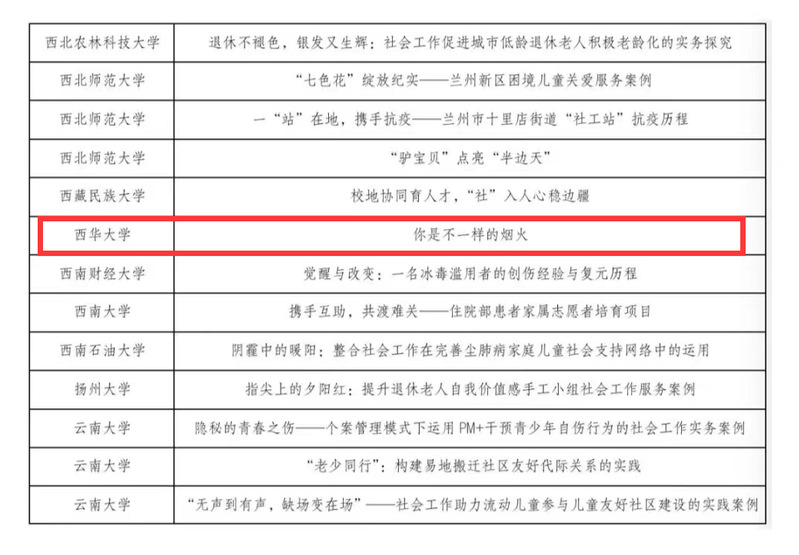 随着大赛的持续进行,第二届“全国MSW研究生案例大赛”百强案例名单公布,西华大学法学与社会学学院刘文娜老师指导、崔岳同学负责的案例《你是不一样的烟火》斩获佳绩,入选百强案例,最终获得第二届“全国MSW研究生案例大赛”优秀奖。