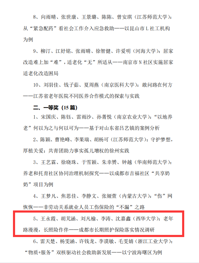 近日,由河海大学、南京大学、南京农业大学、南京师范大学、江苏省老年学学会联合主办,河海大学公共管理学院具体承办的“第二届大学生社会保障案例大赛”决赛以线上形式举行。西华大学法学与社会学学院冉连教师指导的本科生团队(团队成员王永霞、胡芃涵、刘凡榆、李涛、沈嘉鑫),勇创佳绩,最终获得一等奖。