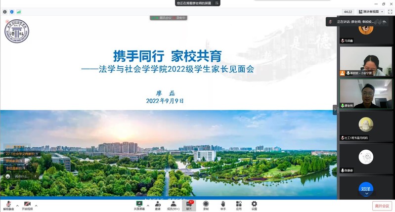 为做好疫情期间的家校互联工作,帮助2022级新生更好地融入大学生活,促进家校沟通,凝聚教育合力,9月9日晚,我院采用线上会议的方式举行2022级新生家长见面会。学院领导班子、各新生辅导员及全体新生家长参加。本次会议由学院学工办主任奉姣主持。