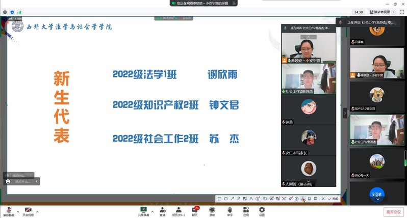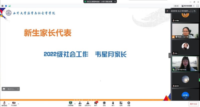 随后,奉姣向各位家长展示近段时间新生入学教育的开展情况。本次新生入学教育共分为线上入学教育、集中于学教育及养成教育三个阶段进行。特别是学院今年为新生设立的“‘易’路携手,共赴青春之约”——法社2022级萌新入学打卡活动和集中入学教育系列活动均受到新生的一致好评,新生们也将这段时间的所思所想、所感所悟通过文字、照片等形式进行分享。