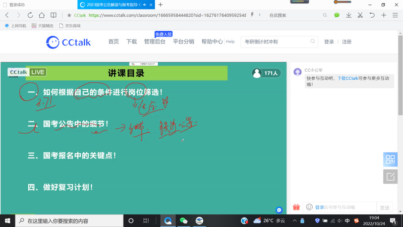 为深入贯彻党的二十大精神,本着“服务学生”的工作理念,将毕业生就业问题作为学生工作的生命线,加强同学们对公务员考试的了解,拓宽同学们的就业思路,提升毕业生就业质量,10月24日晚上19:00-20:30,我院举办了中央机关及其直属机构2023年度考试录用公务员公告解读及报名指导讲座。讲座邀请进仕教育CEO蔡鄂老师主讲,100余名毕业生参加,反响热烈。蔡鄂老师对2023年国考公告进行了全面解读,详细介绍了国家公务员考试的流程、时间等环节,并通过对近三年的国考报名、考试大数据的整理,分析了历年的报名情况及录取比例等,重点结合就业形势,对2023年国考报名职位表进行了详细说明,为同学们梳理报考岗位,指导报名操作,并简要介绍了国家公务员考试的具体题型,帮助同学们更好的针对自己专业、岗位等各类问题进行指导与答疑。讲座内容丰富详实,逻辑清晰,事例贴切,效果明显,对我院学子备考起到了积极作用。