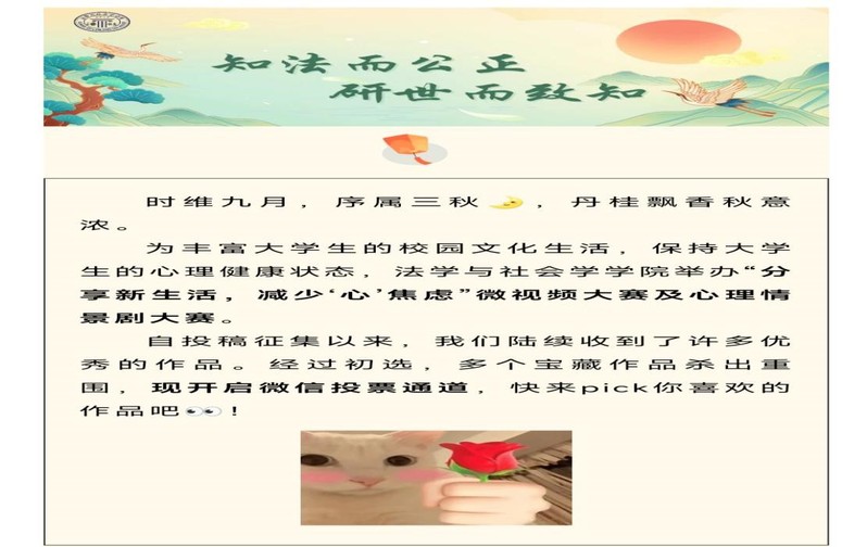 经过激烈的初赛选拔,9月16日,以“分享新生活,减少心焦虑”为主题的线上微视频大赛正式开始,最终共有16个作品进入决赛。决赛通过法学与社会学学院的微信公众号进行线上投票。
