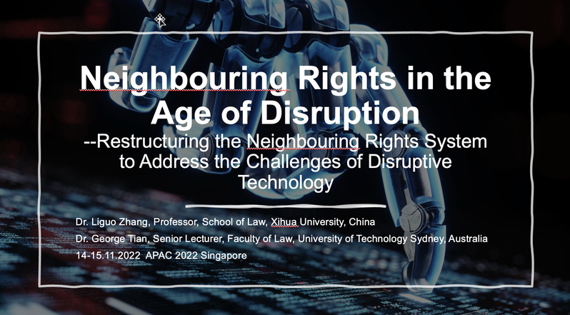 1114-15日,亚洲太平洋版权协会(APCA2022国际学术会议在新加坡国立大学法学院通过线下和线上混合方式举办,今年会议的主题是Copyright in the Age of Disruption”。我知识产权学院张利国教授和悉尼科技大学高级讲师田一钧博士合著的论文被大会录用,并受邀参会作报告。因疫情原因无法赴新加坡参会,在线上参会并以““Neighbouring Rights in the Age of Disruption - Restructuring Neighbouring Rights System to Address the Challenges of Disruptive Technology”为题作报告。报告中提出重构邻接权体系以应对颠覆性技术对现有版权体系带来的冲击和挑战的方案。此次会议还邀请到世界知识产权组织总干事Daren Tang先生做主题报告。