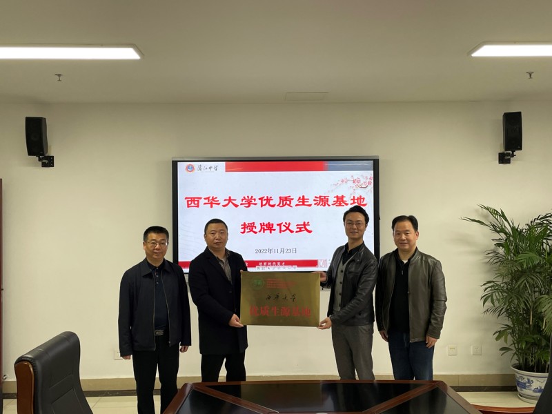 在蒲江中学会议室中,蒲江中学党委书记雷德健、党委副书记兼校长向猛对学院招生宣讲团的到来表示热烈欢迎。双方就西华大学招生、专业优势、就业等方面进行了深入交流。双方均表示未来将进一步加强交流合作,为培养优秀人才共同努力。座谈交流后,廖磊、张新泉代表学校授予蒲江中学“西华大学优质生源基地”牌匾。