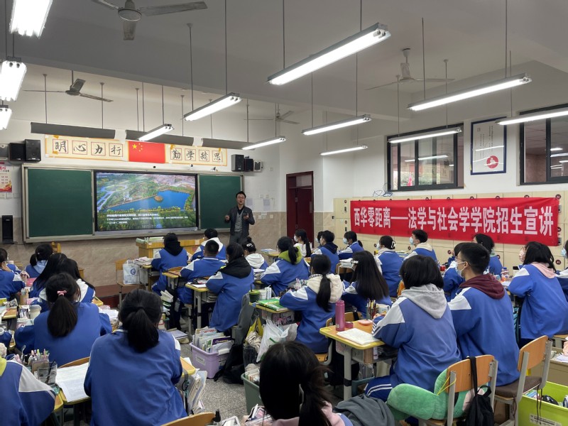 招生宣传工作是宣传学校办学特色和专业特色,展现学校整体风貌,提升学校社会知名度、认可度和美誉度的重要手段。为进一步扩大学校招生社会声誉,吸引更多的优秀学生关注和报考西华大学,11月23日法学与社会学学院党委副书记廖磊、学院专职组织员张新泉、学院辅导员马泽鑫奔赴蒲江中学开展招生宣讲活动。